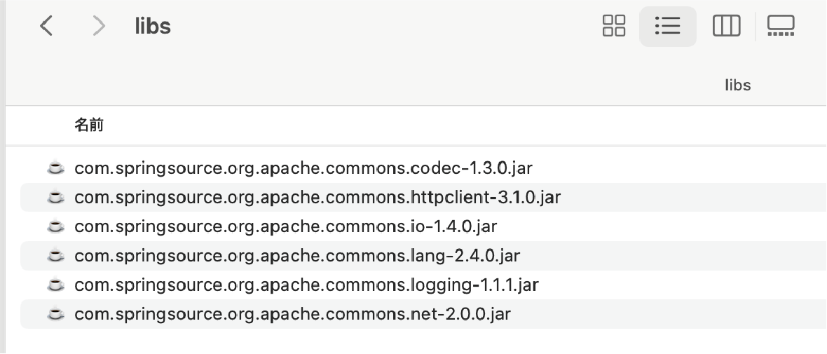 dependencies { ・・・省略・・・ implementation files('libs/com.springsource.org.apache.commons.codec-1.3.0.jar') implementation files('libs/com.springsource.org.apache.commons.io-1.4.0.jar') implementation files('libs/com.springsource.org.apache.commons.lang-2.4.0.jar') implementation files('libs/com.springsource.org.apache.commons.httpclient-3.1.0.jar') implementation files('libs/com.springsource.org.apache.commons.logging-1.1.1.jar') implementation files('libs/com.springsource.org.apache.commons.net-2.0.0.jar') |