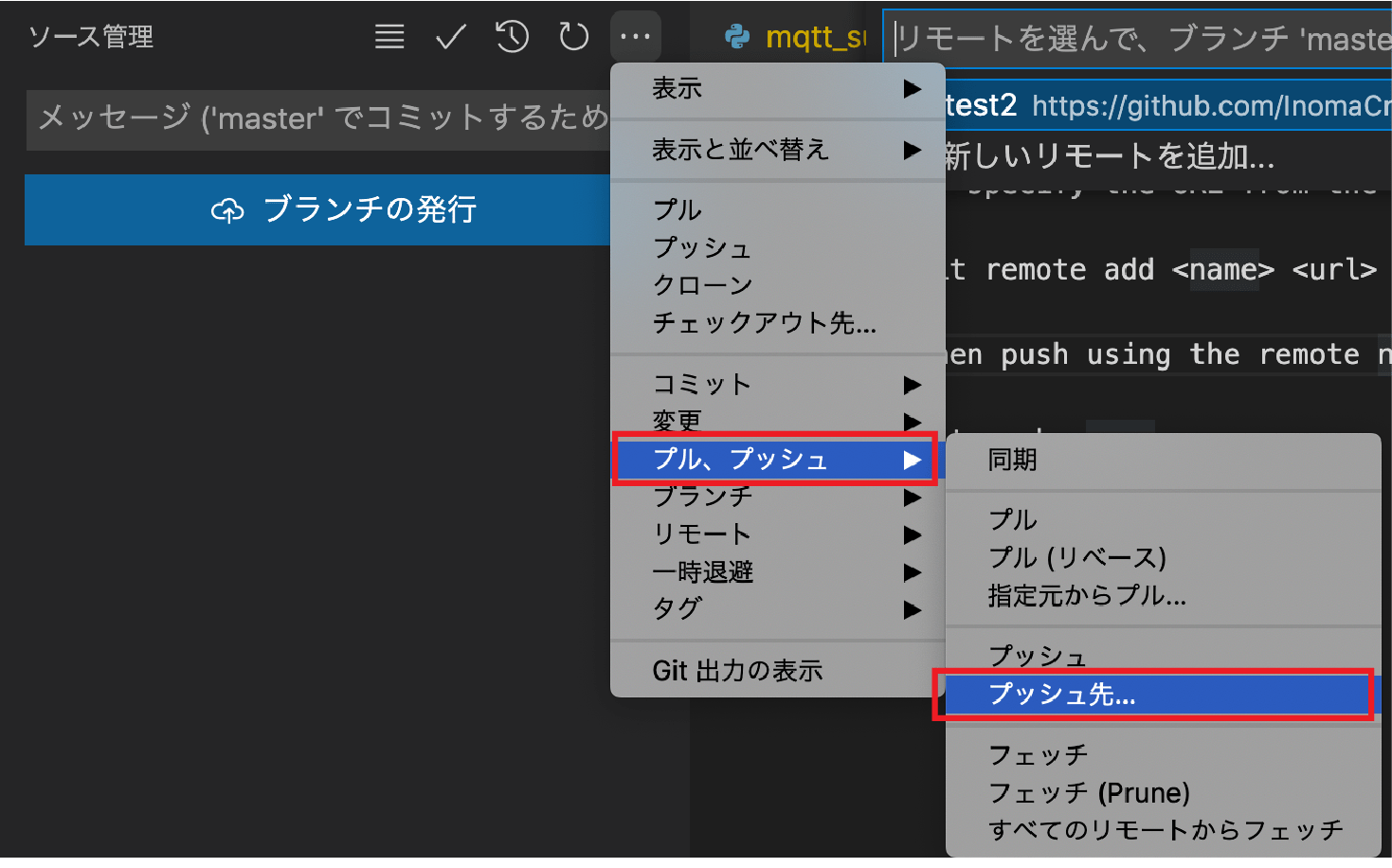 ソース管理メニューからプル、プッシュ→プッシュ先を選択します。