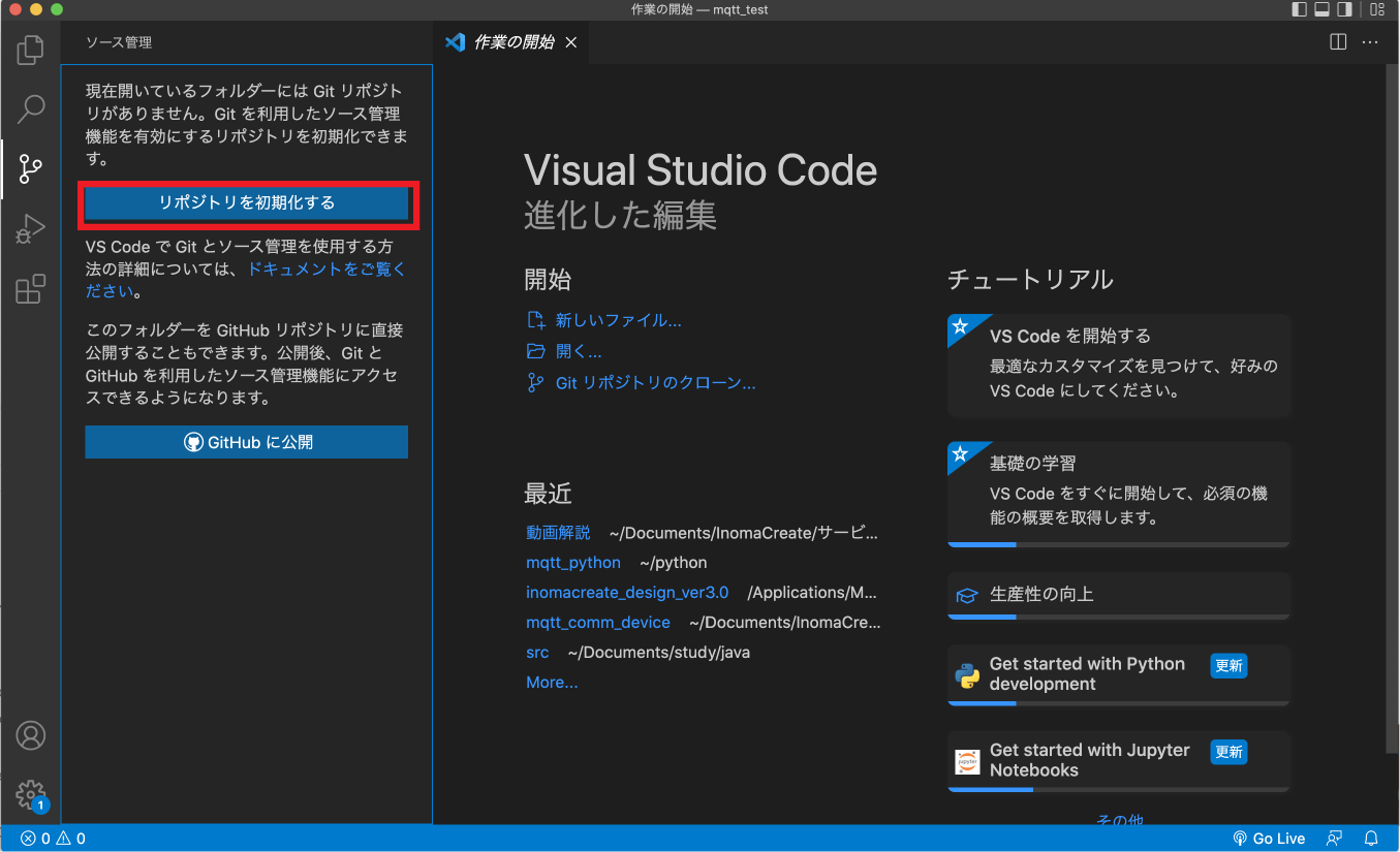 「リポジトリを初期化する」ボタンを押します。これで、Gitでバージョン管理するための環境(ローカルリポジトリ)が作成されます。