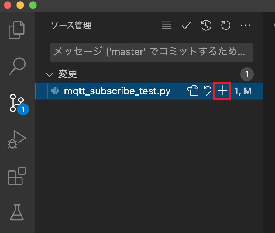 ソースを変更すると、ソース管理の変更リストにファイルが表示されますので、+マークをクリックし、ステージングエリアへ移動させます。