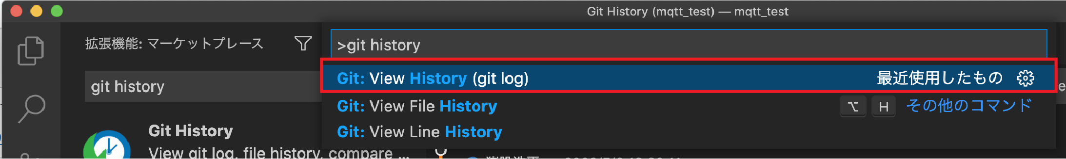 git historyと入力し、Git: View History(git log)を開きます。