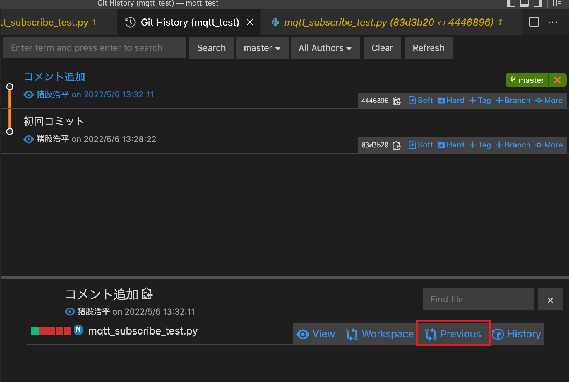 以下のように変更履歴が確認できます。また、Previousを押すと、変更前との差分も確認できます。