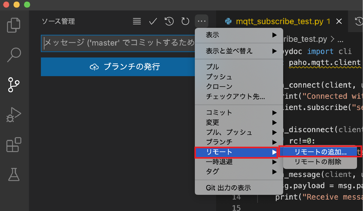 ソース管理のメニューから、リモート→リモートの追加をクリックします。